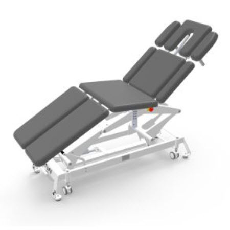 ELX1004-D五折多體位手法床產品介紹:1、5cm高密度海綿2、防污PVC3、透氣孔加孔塞設計4、伸縮腳輪設計,方便床身移動5、Ti Motion電機8000N6、腳圈控制升降調節7、頭部氣桿控制...